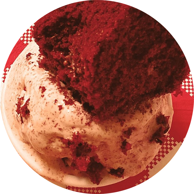 Rich cream cheese ice cream with delicious red velvety crumbled pieces.